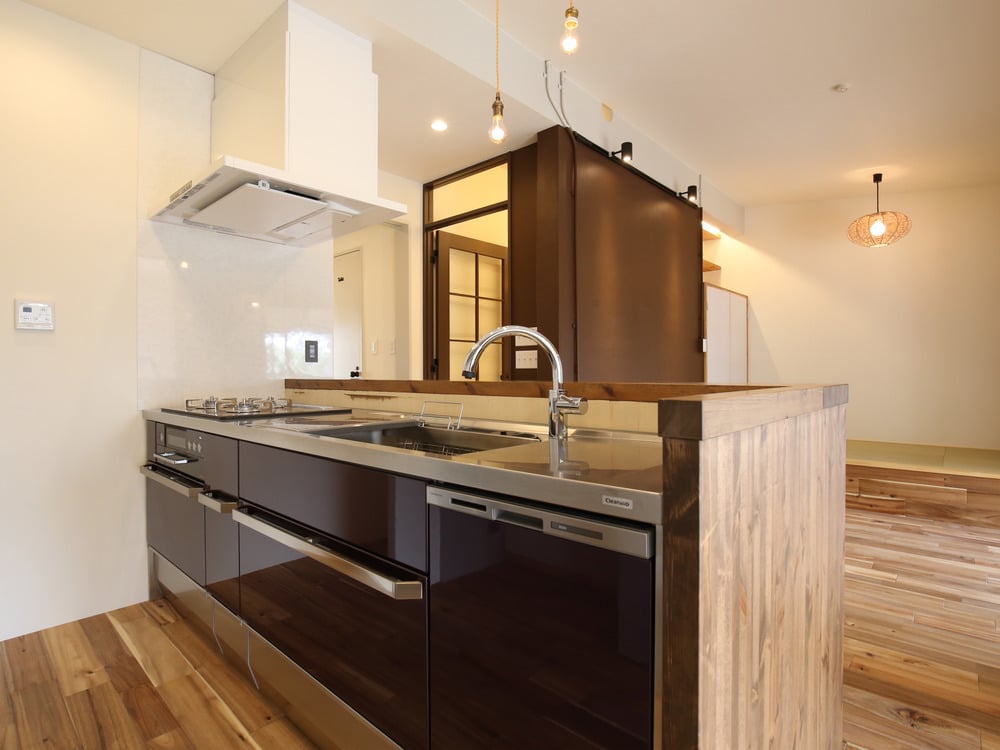 吊り戸棚のないオープンキッチンだとデメリットになりがちな、「キッチンの背面が見えてしまう」、「収納が少ない」という点もしっかりカバーできています。