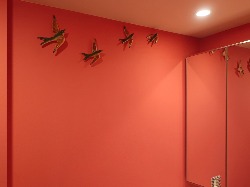 突然のおもいつきでテックスメックス風にコンセプトが変更されたので、それらしくなるように小道具を調達。といってもマスキングテープをひと巻き買ってきただけ。洗面台の両端にチラッと見えてるメラミン樹脂の部分と、風情のなかったプラスチック製のスイッチパネルにマスキングテープを貼る。テープがあまったので巾木にも貼ったけど(貧乏性だから)ちょっとやりすぎたかも。あとはむかしメキシコでお土産に買ってきたお気に入りの陶器の鳥(ツバメ?)を壁に配置した。テックスメックス風にしたというより、なりゆきでメキシカン屋台村に来てしまった、という感じか。