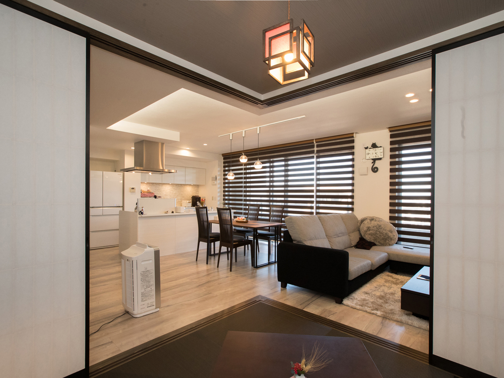 和室の天井をリビングよりも低め+暗めに設定しているので、和室からリビングを見るとより開放的に見えます。