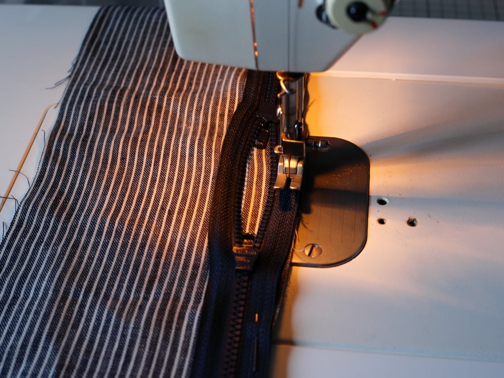 ファスナーの務歯(ムシ)端から5mm程度の場所を縫っていきます。縫い進める途中で、まち針が邪魔になるので、抜きながら縫い進めます。