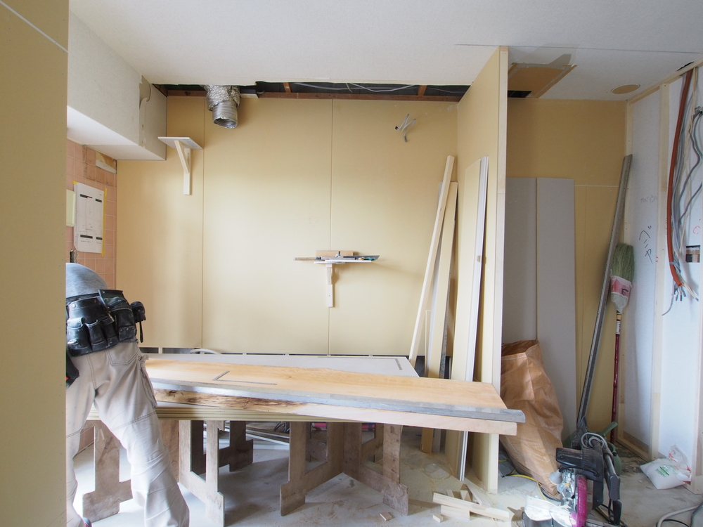 キッチンスペースの壁を造作中。