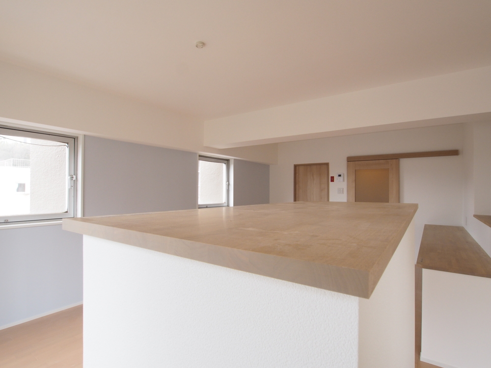 カウンターなど造作完了。クロスを施工しました。