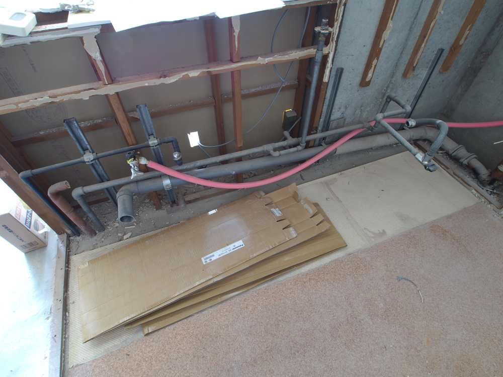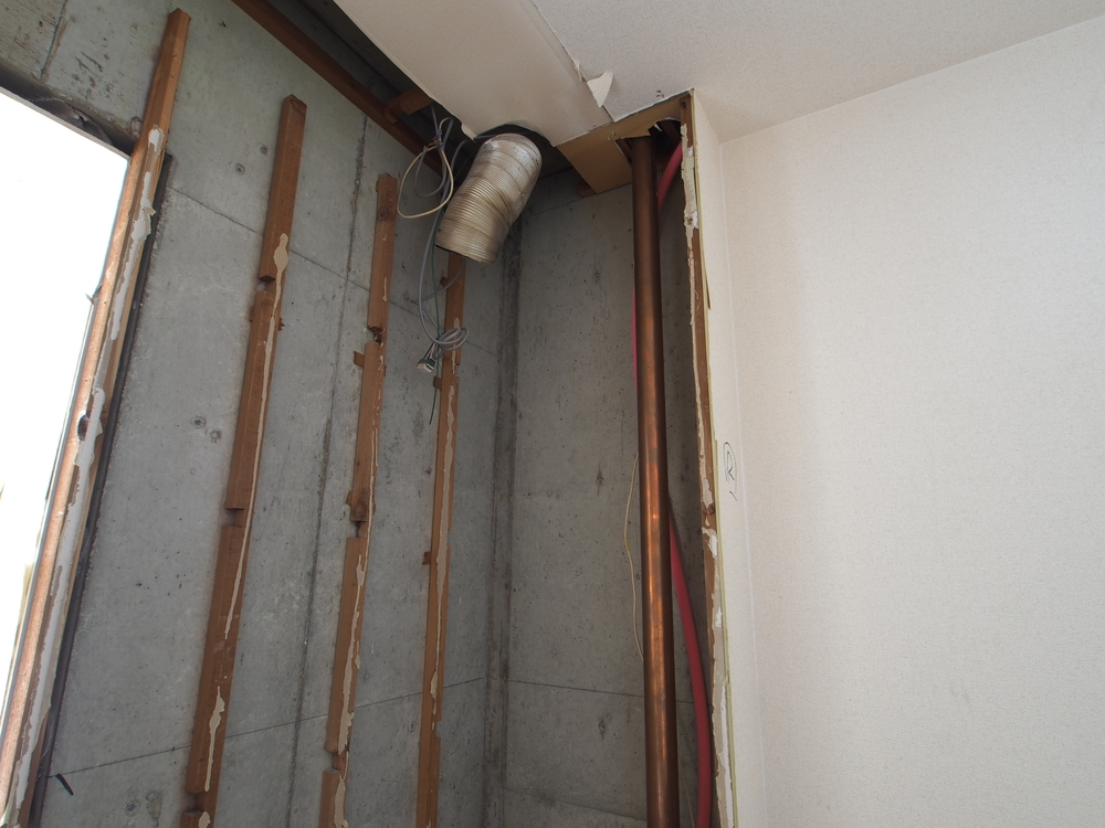 インターフォンの壁が取り去られて、少しだけ開放的なキッチンに。後の箇所は、耐力壁・梁なんで、仕方無し。。。