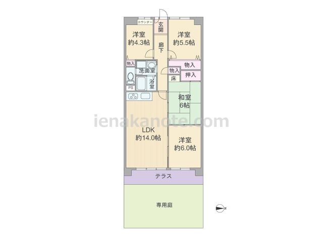 専有面積77.8平米の4LDK。専用庭付きプラン。LDKと和室6帖、洋室約6.0帖が続き間になっており、引き戸を開放すれば空間を広々と使う事が出来ます。キッチンは開放的なI型のウォールタイプ。洋室約6.0帖には収納がありませんが、その他の...