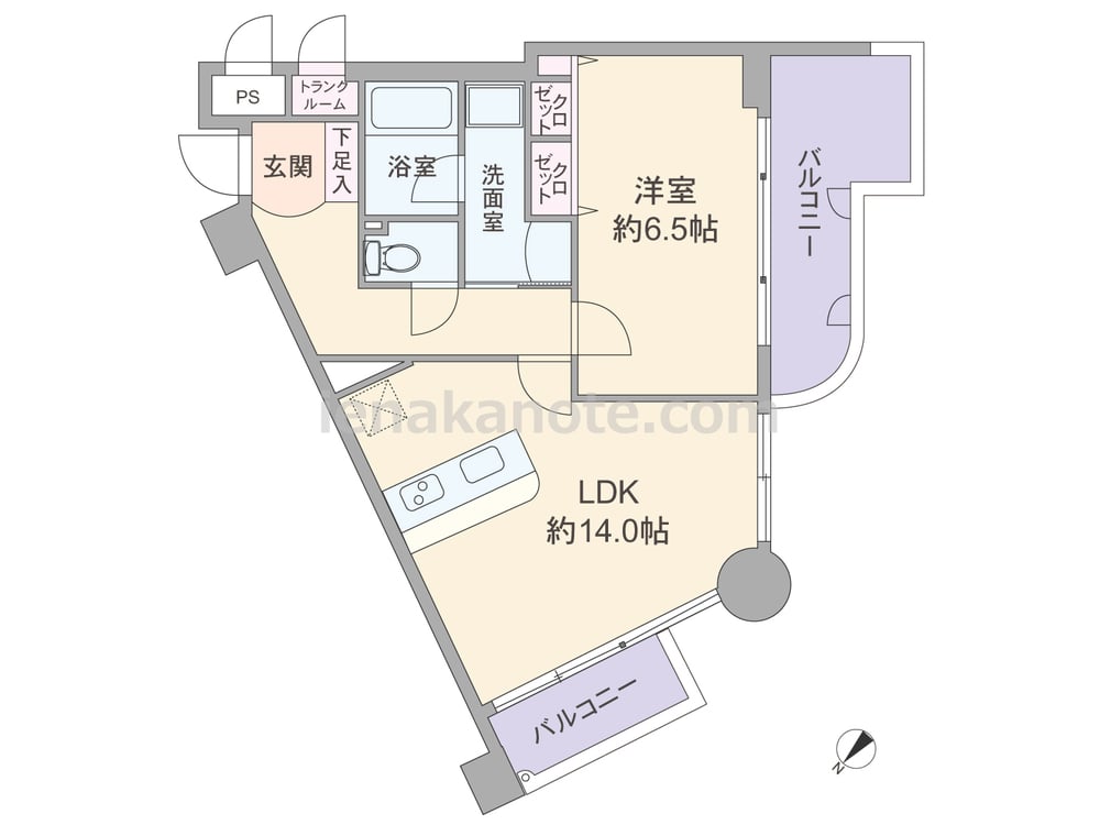専有面積43.03平米の1LDK。共用廊下に住居の窓が面しておらず、玄関から直接居室を見通せない造りでプライバシーを確保したプラン。LDKは約14.0帖、キッチンは料理をしながら会話を楽しめる対面カウンタータイプ。収納はクロゼットとトランクルームがあります。バルコニーが2カ所あり、ガーデニングスペースの利用にもよさそうです。