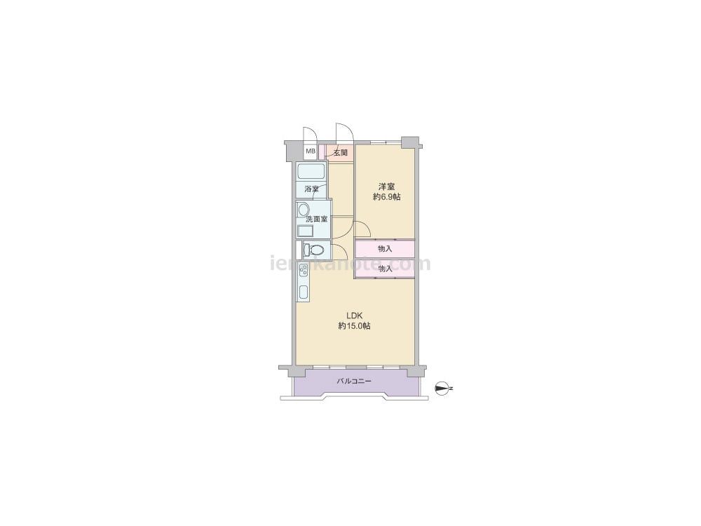 専有面積53.76平米の1LDK。キッチンは壁付けのオープンタイプ。主寝室は約6.9帖大。LDKと主寝室には、収納力のある大型の物入があります。