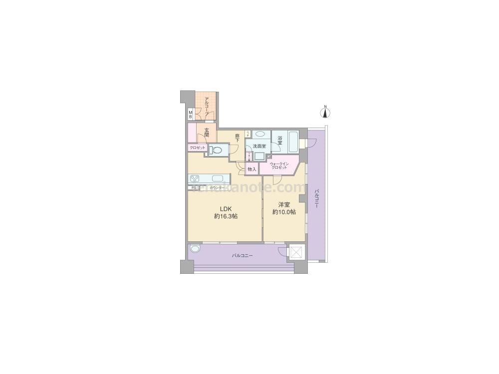 専有面積59.90平米の1LDK。玄関前にアルコーブがあり、共用廊下に直接面する居室の無いプライバシー重視のプラン。LDKは16.3帖、キッチンはカウンタータイプ。LDKと洋室は続き間になっており、仕切り戸を開放すれば26.3帖のワンルームとしても使えます。玄関のクロゼットや、洗面室の物入れ、ウォークインクロゼットなど収納スペースが充実。浴室に窓があり、換気がしやすく快適です。
