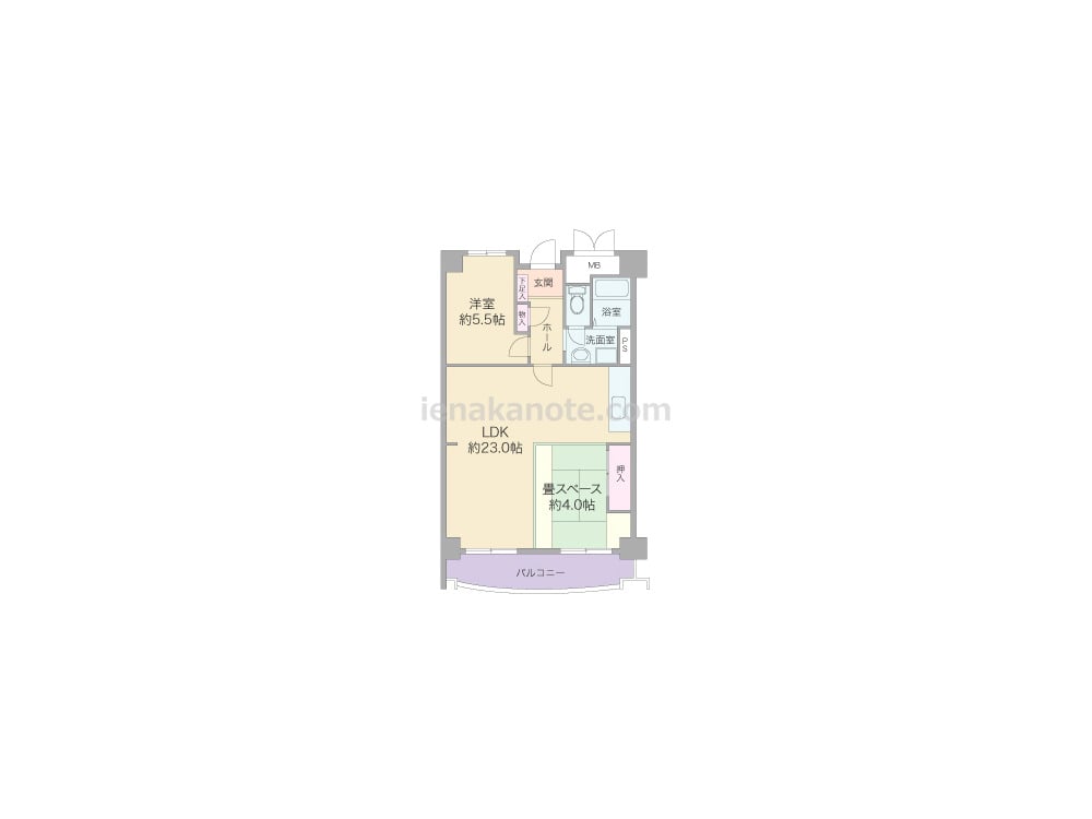 専有面積62.46平米の1LDK。廊下の短い専有面積を有効利用したプラン。キッチンは壁付けのオープンタイプ。LDKはゆとりの約23帖大。LDKと和室が続き間で、生活シーンに合わせてフレキシブルに使用出来ます。