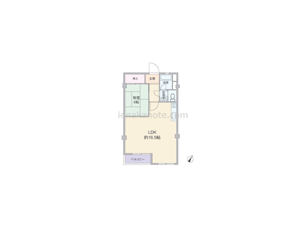 専有面積46.98平米の1LDK。キッチンはリビング・ダイニングを広く使える壁付けタイプ。約16.5帖と広々したLDKが特徴です。和室6帖が隣接しているため、襖を開放すれば、大きなワンルームとしても利用可能。収納は和室の押入れのみで、多少の工夫が必要です。