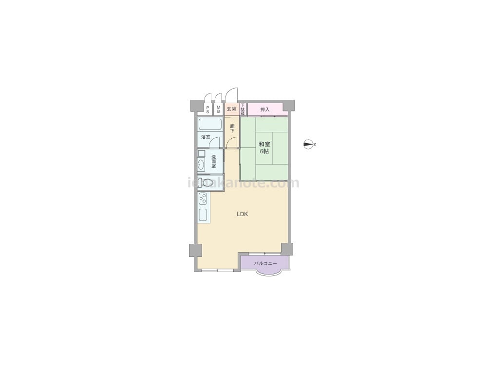 専有面積44.87平米の1LDK。廊下の短い居室空間を優先したプラン。キッチンは壁付けのオープンタイプ。LDKと和室が続き間で、ビッグワンルームとしても使用出来ます。ただバルコニーはあまり広さがありません。
