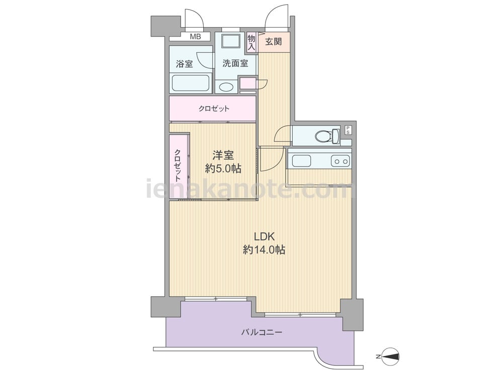 専有面積49.14平米の1LDK。キッチンは壁付けタイプ。リビング・ダイニングを広く使える配置です。洋室約5.0帖がLDKに隣接しているため、扉を開放すれば、大きな一つの部屋としても利用可能。この洋室には収納スペースが2箇所にあり、専有面積の割に収納が豊富です。洗面室に窓があります。