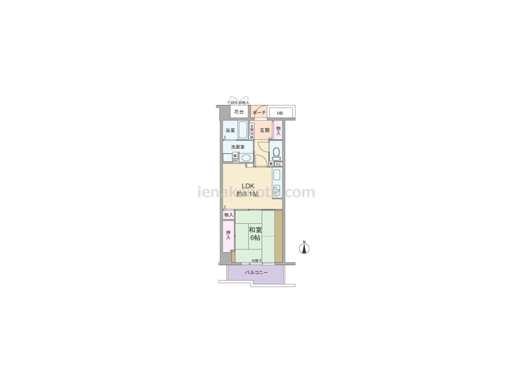 専有面積43.66平米の1LDK。室内廊下が短く、居住スペースを広く取ったプラン。LDK約8.1帖と和室6帖は続き間になっていますので、つなげてひとつの部屋としても使えます。和室、LDK、玄関にそれぞれ収納付きです。