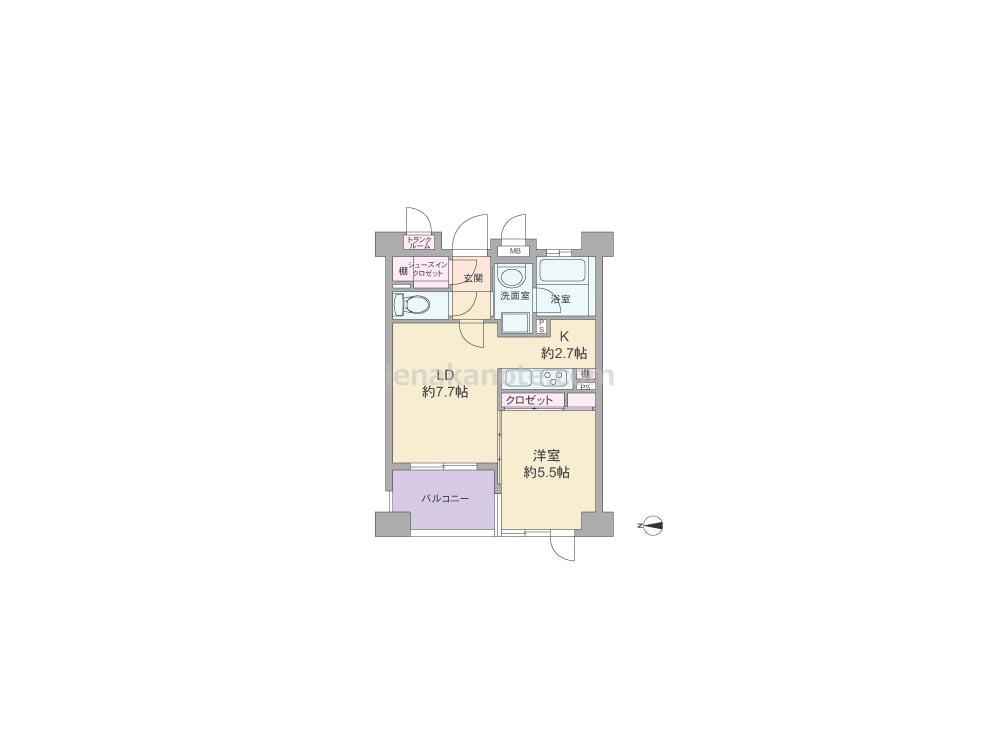 専有面積40.21平米の1LDK。廊下面積がほとんどなく、居住空間を広くとれているプラン。LDKは10.4帖、キッチンは独立タイプ。トランクルームやシューズインクロゼットがあるなど、収納スペースが充実しています。洋室約5.5帖にコーナーサッシが用いられているのも特徴的。浴室に窓があり、換気がしやすく快適です。