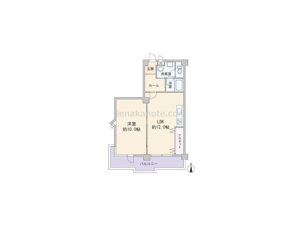 専有面積50.29平米の1LDK。共用廊下に直接面した住居の窓が無い、プライバシーが確保されたプラン。キッチンは壁付け・オープンタイプでリビングダイニングを広く使える配置。洋室約10.0帖はコーナーサッシが用いられ明るく・開放感があり、LDK約12.0帖を通ってアクセスするため家族のコミュニケーションの機会が増えます。なお2カ所から出入りが可能なため、壁で間仕切れば2LDKに間取り変更出来ます。(リフォーム費用必要)収納スペースはLDKにしか無いため、収納家具を置くなどの工夫が必要。洗面室を通ってトイレに出入りする造りで、洗面室・トイレ使用時の動線が重なっています。