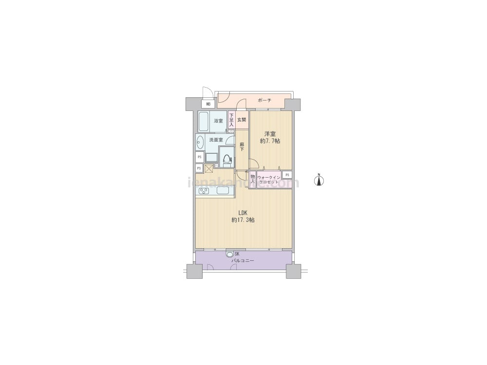 専有面積64.02平米の1LDK。共用廊下と玄関・居室の間に専用ポーチがある、プライバシーに配慮されたプラン。LDKは約17.3帖大と開放感があり、カウンタータイプのキッチンは家事をしながら家族の様子を伺えます。洋室約7.7帖には収納力のあるウォークインクロゼットがあり、LDKにも物入が設けられています。スロップシンク付きのバルコニーは約12.02平米とゆとりがあり、ガーデニングを楽しむのにぴったりです。