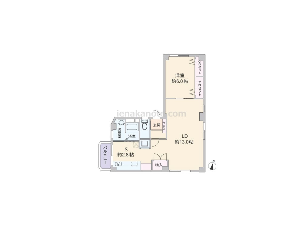 専有面積51.79平米の1LDK。リビング・ダイニング約13.0帖とキッチン約2.8帖が分かれて配置されているため、リビングスペースはくつろぎの空間を保つ事が出来ます。キッチン背面に洗濯機置き場、キッチン横にバルコニーがある家事動線の良い造り。トイレ・洗面室には換気に配慮された窓があり、収納スペースが各所に設けられているのも特徴です。