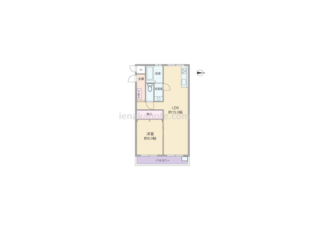 専有面積50.35平米の1LDK。玄関先から室内が見通せない、プライバシーを保ちやすいプラン。LDKは約15.0帖のゆとりがあり、東西両面に窓があるのもポイント。浴室にも窓があり、換気がしやすく快適です。洗濯機置場はバルコニーに設けられています。