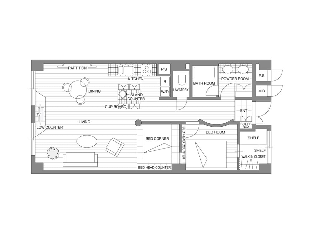 玄関を入るとLDKまで一直線に空間が繋がる、抜け感のあるプラン。キッチンは壁付け・オープンタイプの仕様で、キッチン背面のアイランドカウンターは料理の盛り付けや作業台に便利です。リビングの一角に設けられたベッドコーナーは、大きなソファーにしてくつろいだり、お昼寝スペースにもぴったり。玄関横の洋室はアールの壁が空間に動きを演出し、共用廊下に面する部分を収納にしてプライバシーを確保。ダブルボウルの洗面台が用いられ、集中しやすい朝の時間帯でも2人同時に身支度をする事が出来ます。