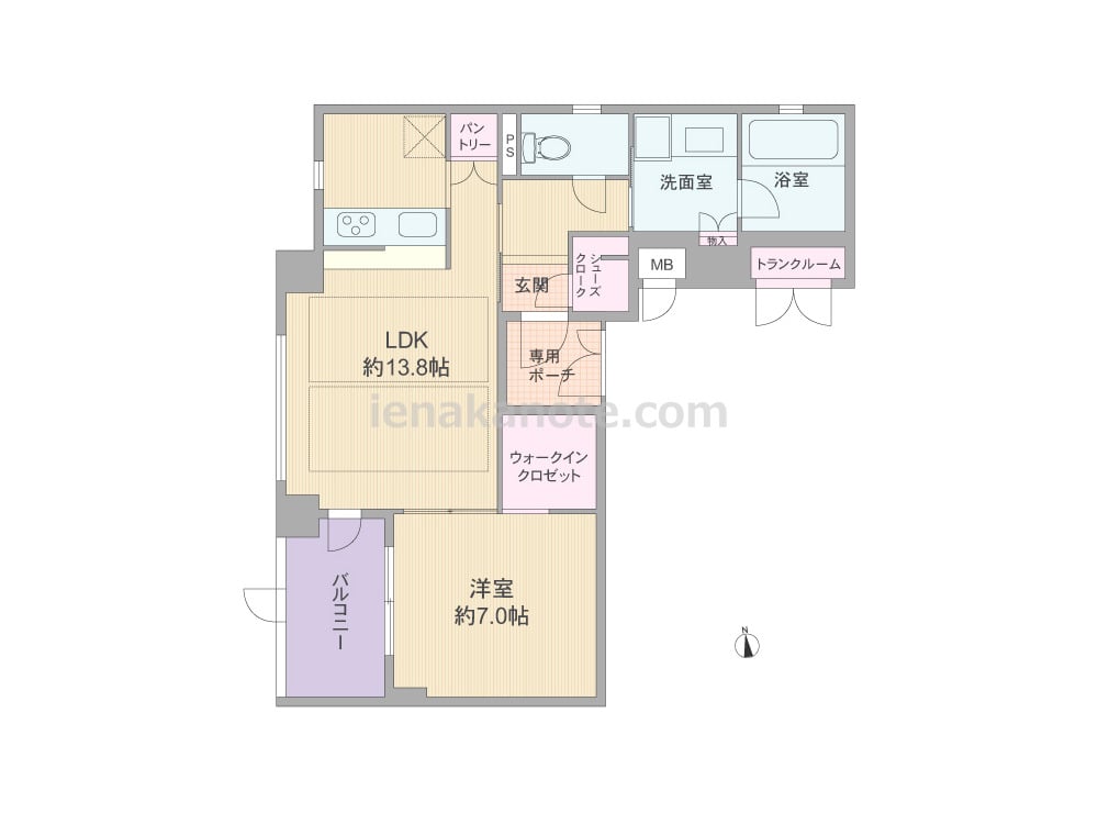 専有面積53.62平米の1LDK。共用廊下に面する窓が無く、玄関前に専用ポーチが付いたプライバシー重視のプラン。LDKは約13.8帖、キッチンは対面カウンタータイプの仕様で、キッチン横にパントリー付き。洋室約7.0帖にはウォークインクロゼット、玄関横にはシューズクロークがあり、共用廊下に面してトランクルームも設けられています。浴室、トイレ、キッチンの窓は換気がしやすく快適です。