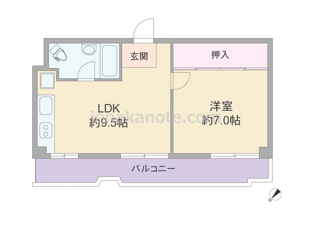 専有面積35.91平米の1LDK。居室の窓が全てバルコニーに面する、ワイドスパンのプラン。玄関を入るとLDK約9.5帖が広がります。キッチン横に洗濯機置場があり、サニタリーはホテルライクなスリーインワンタイプ。洋室約7.0帖の壁一面にクロゼットが設けられています。