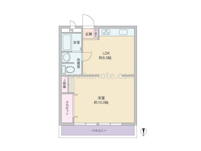 専有面積18.34平米の1K。廊下部分にキッチンと洗濯機置き場、浴室と洗面室、トイレが一体型となったユニットバスが配置されている、コンパクトなプランです。