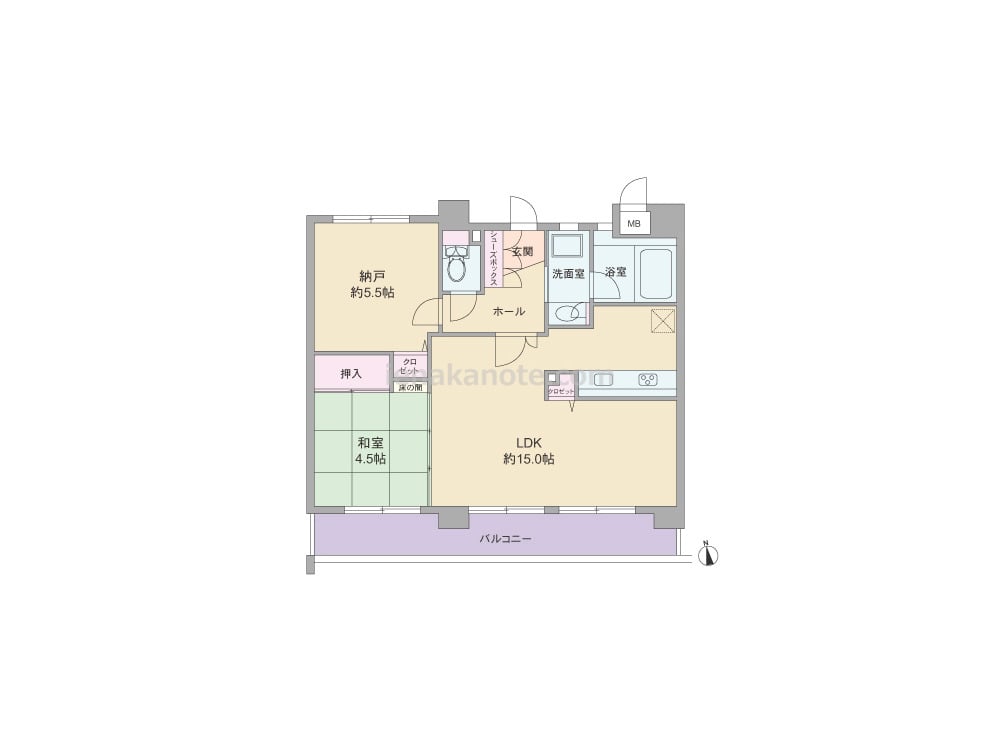 専有面積55.27平米の1SLDK。廊下が短く、居住空間を広く取ったプラン。キッチンは独立タイプで、リビング・ダイニングから見えにくく、急な来客でも安心。リビングに隣接した和室4.5帖は、襖を開放すれば、家族団らんのスペースとしても活躍しそうです。納戸約5.5帖は、洋室仕様のため居室としても十分使えます。各室に収納スペース付きです。