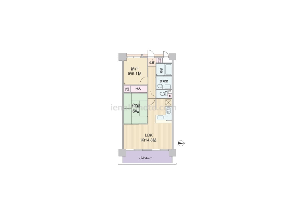 専有面積56.43平米の1SLDK。LDKは14.8帖、キッチンはカウンタータイプで、家事効率の良いL字型。リビングと和室が続き間になっており、襖を開けるとより広々とリビングを使えます。全室に収納スペース付きです。