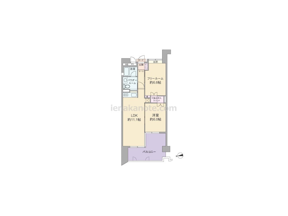 専有面積51.39平米の1SLDK。玄関前にはポーチ付き。キッチンは壁付けタイプ。LDKに洋室約6.0帖が隣接しており、扉を開放して、約17.1帖の空間としても利用可能。また約6.6帖のフリールームは洋室仕様のため、居室としても十分使えます。バルコニーはゆったりと広く、ガーデニングなども楽しめそうです。洗面室とトイレは一体型。浴室には窓があります。