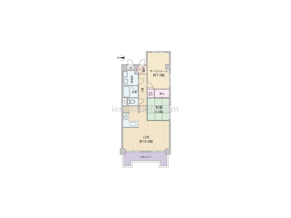 専有面積58.55平米の1SLDK。キッチンは使い勝手の良いL字型。和室4.5帖がLDKに隣接しており、襖を開放すれば、約19.5帖の空間としても利用可能です。約7.5帖のサービスルームは洋室仕様。各部屋に収納スペースと窓があります。