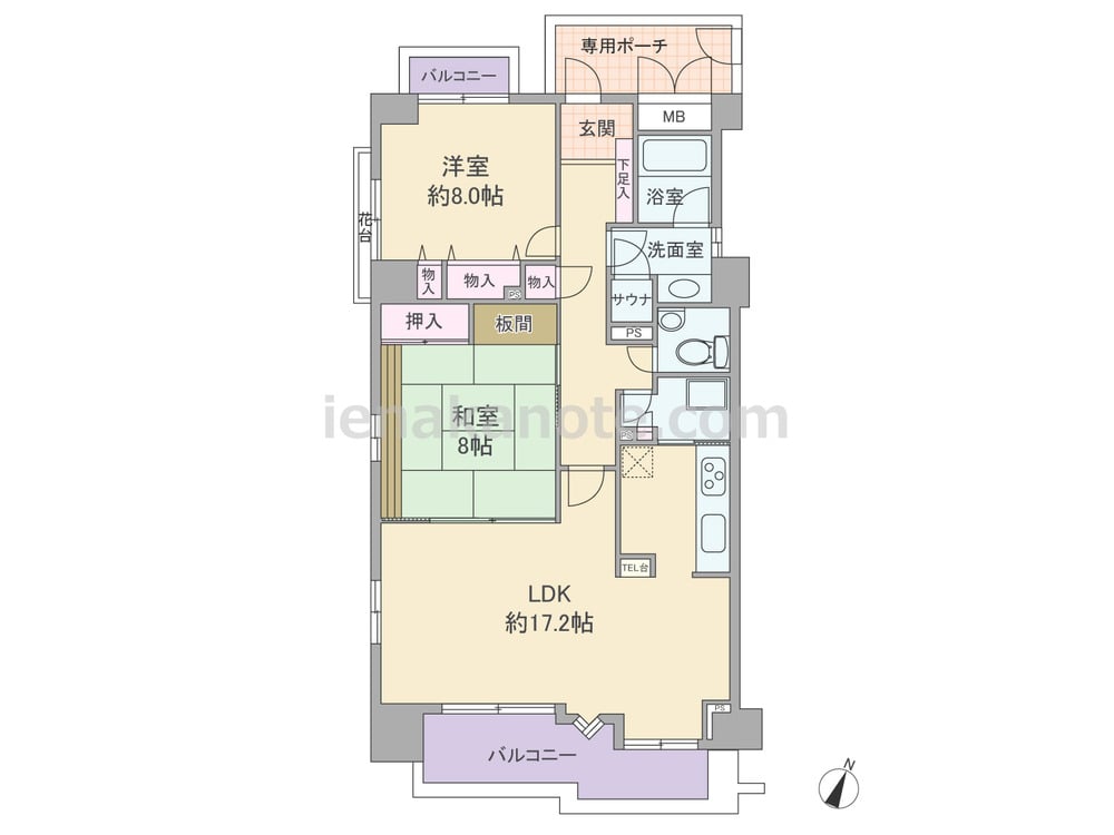 専有面積93.96平米の2LDK。玄関前にプライバシーに配慮されたポーチ付き。LDKと主寝室は開放感のある2面採光です。キッチンは独立型で、すぐ横に便利なユーティリティ(洗濯機置場)があります。洗面室に換気窓が設けられ、サウナがあるのも特徴です。洋室約8.0帖にはバルコニーと花台があります。