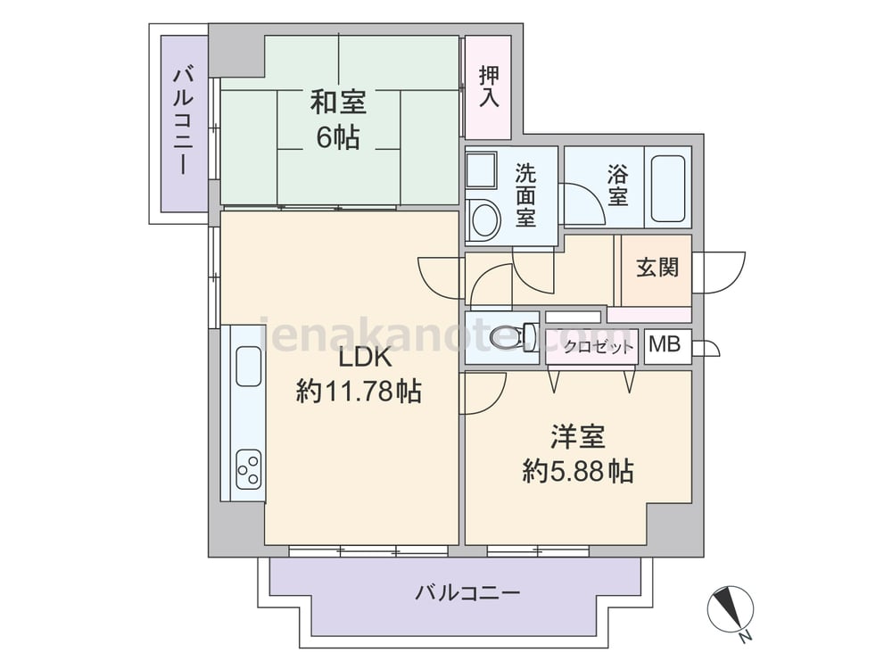 専有面積51.75平米の2LDK。共用廊下に居室の窓が直接面していない、プライバシーに配慮されたプラン。どの部屋もLDKを通ってアクセスするため、家族のコミュニケーションの機会が増えます。LDKは2面採光、和室6帖の襖を開放すれば約17.78帖大の空間に。全部屋バルコニーに面しているのも特徴です。