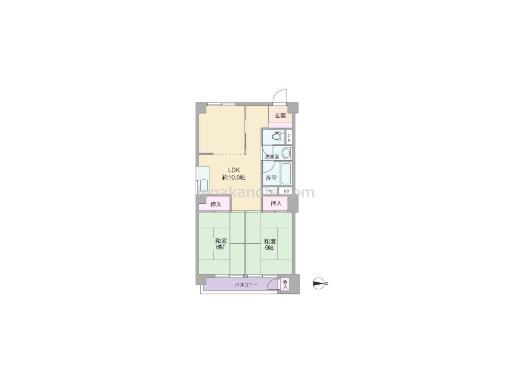専有面積54.26平米の2LDK。キッチンは目の前に窓があり、調理中換気がしやすいのがポイント。収納スペースは和室とバルコニーに設けられ、LDK約10.0帖の一角にある空間を仕切れば、もう一部屋追加する事が出来ます。(リフォーム費用必要)洗面室を通ってトイレに出入りする造りのため、洗面室・トイレ使用時の動線が重なっています。