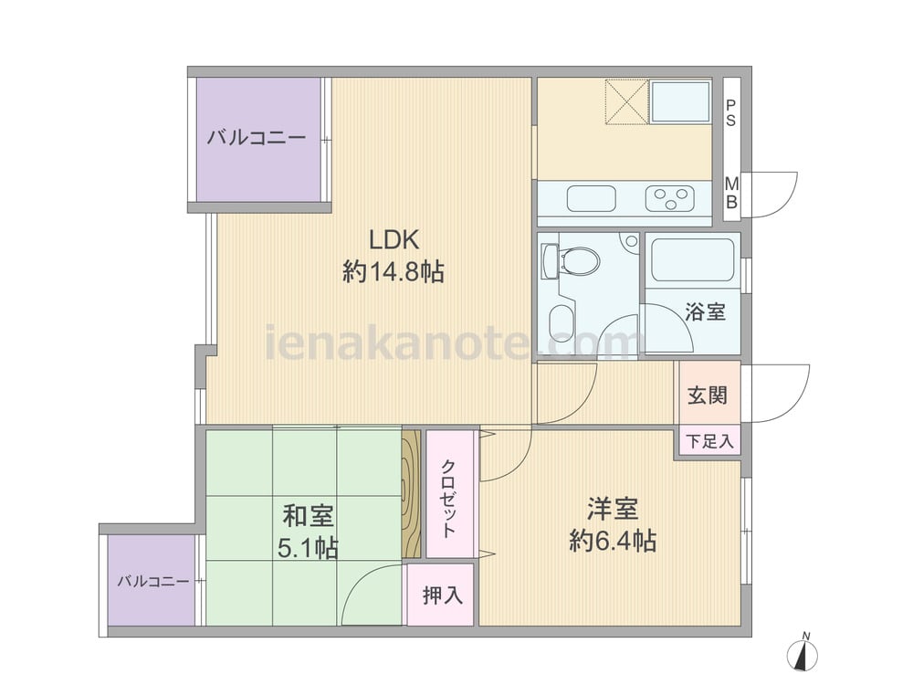 専有面積54.05平米の2LDK。どの部屋もLDK約14.8帖を通って出入りするため、家族のコミュニケーションの機会が増えます。LDKは約14.8帖、生活感の出やすいキッチンは独立型で、キッチン背面に洗濯機置場付きです。洗面室・トイレはホテルライクな一体型。浴室の窓は換気がしやすく快適です。