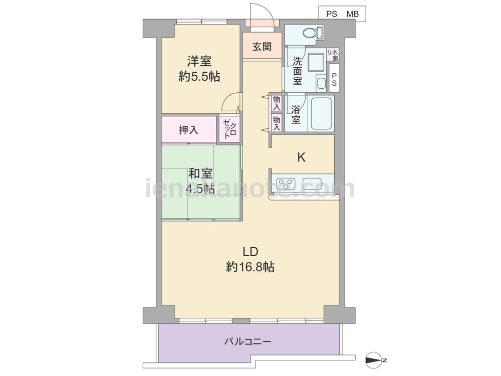 専有面積62.59平米の2LDK。リビング・ダイニングは約16.8帖の広さがあり、対面式キッチンからリビング・ダイニングを見渡す事が出来ます。和室4.5帖は個室やくつろぎのリビングスペースなど色々な用途に利用可能。各居室と室内廊下に収納があり、洗面室にはリネン庫もあります。