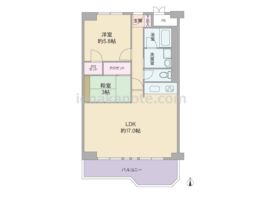 専有面積62.21平米の2LDK。玄関扉は防犯面で安心の内開き型です。キッチンはI型・ウォールタイプ。LDKは約17.0帖の広さがあり、和室3帖はくつろぎのリビングスペースによさそう。家具置場に便利な板間付きです。バルコニーは一部出幅があります。