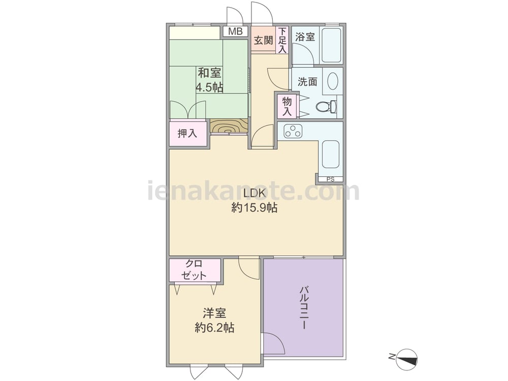 専有面積58.05平米の2LDK。約15帖のLDKは横に長く、家具の配置がしやすいタイプです。キッチンは家事効率の良いL字型。個室と洗面室に収納が設けられています。