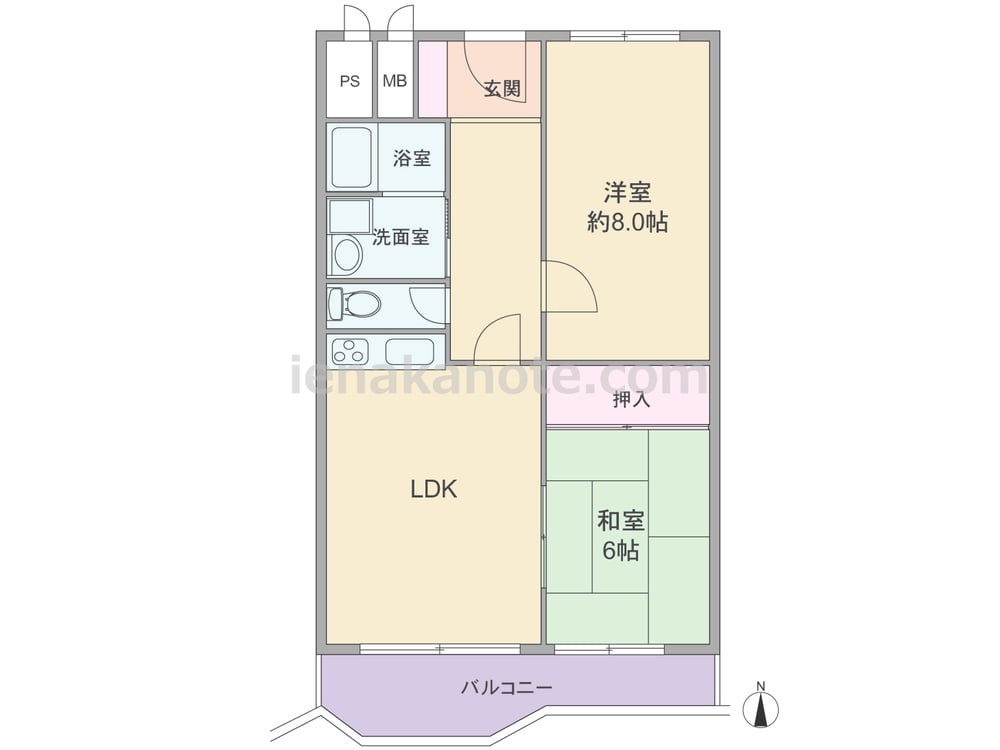 専有面積58.17平米の2LDK。6帖以上のゆとりが確保されたプラン。玄関ドアは防犯面で安心の内開きタイプです。LDKと和室帖が続き間で、キッチンは家事に集中しやすい壁付け仕様。洋室約帖にはクロゼットが無いため、収納家具を配置するなど少し工夫が必要です。