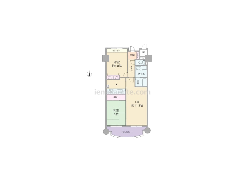 専有面積59.91平米の2LDK。生活感を感じさせやすいキッチンは独立型のため、リビングダイニングはくつろぎの空間を保つ事が出来ます。和室6帖の襖を開放すれば、約17.3帖大の空間としても利用可能。各居室に収納スペースがあります。