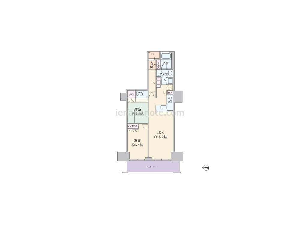 共用廊下に直接面した窓がなく、プライバシーを確保しやすいプラン。キッチンは使い勝手のよいL字型のカウンタータイプで、直接洗面室へアクセスできる2WAY。LDKの隣には和室4.5帖が隣接しており、開放すれば約19.7帖のスペースとしても利用可能。各室に収納スペース付きです。