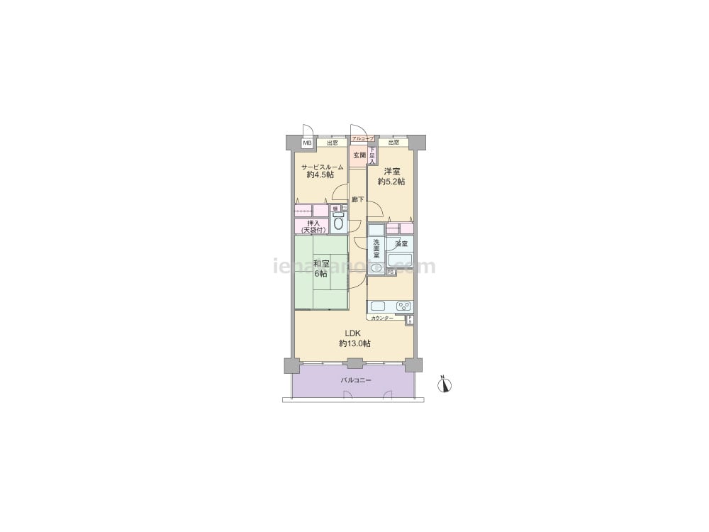 専有面積63.01平米の2SLDK。玄関前にアルコーブ付き。キッチンはカウンタータイプ。横長リビングのプランで、LDKは明るく、開放感のある空間。各部屋に収納スペースがあります。