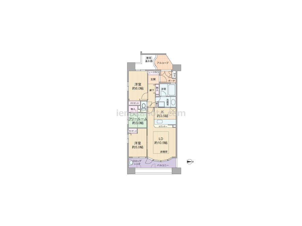 専有面積64.58平米の2SLDK。玄関前にアルコーブとポーチがあり、室内への動線がクランク状になったプライバシーに配慮されたプラン。キッチンはカウンタータイプで、洗面室に直接アクセスできるツーウエイ。リビング・ダイニングの窓は開放感のあるアール型のサッシ。LDKと洋室が続き間で、約19帖の一つの空間としても使用可能。浴室にも窓があり、換気がよく快適です。