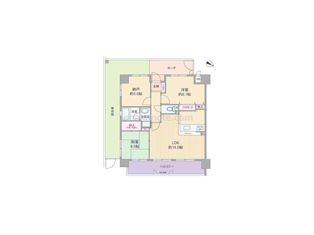 専有面積62.56平米の2SLDK。玄関前には大きなポーチ付き。南側にはL字型の広い専用庭があり、子供の遊び場やガーデニングスペースにもぴったり。共用廊下に直接面した窓がなく、独立感のある部屋。キッチンはカウンタータイプ。リビングには和室4.5帖が隣接しており、襖を開放して、リビングの延長としても利用できます。各室に窓があり、浴室にも窓付きで、湿気がこもりにくく快適。納戸約5.0帖は洋室仕様のため、居室としても使えます。
