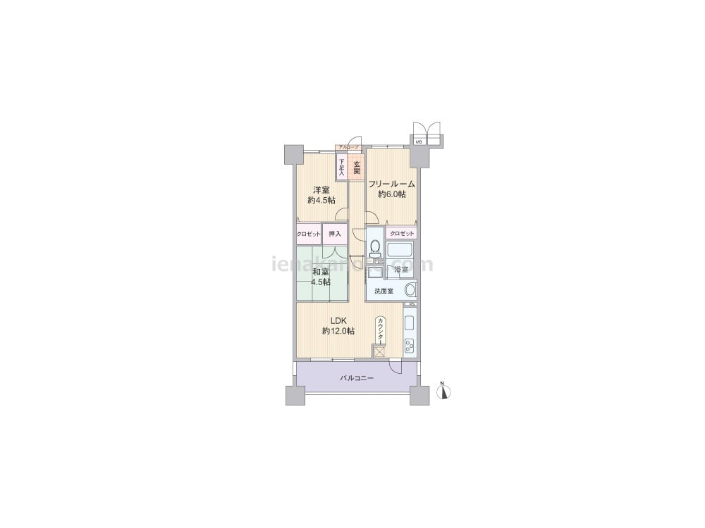 専有面積60.48平米の2SLDK。玄関前にアルコーブ付き。LDKは12帖、キッチンは壁付けタイプで、使い勝手の良いバックカウンターが付いています。キッチン横にはバルコニーへ出られる勝手口があり、家事効率が良いです。リビングと和室は続き間のため、襖を開ければより広々とリビングを利用可能。各室に収納スペース付きです。