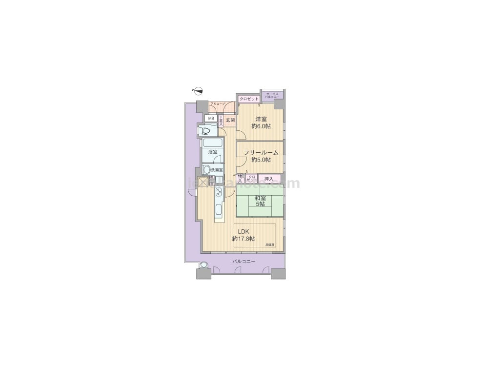 専有面積66.08平米の2SLDK。玄関前にアルコーブがあり、共用廊下に直接面する居室の無いプライバシー重視のプラン。バルコニーは広々L字型で、物干しスペースに困らないのはもちろん、ガーデニングなどを楽しめるゆとりがあります。LDKは17.8帖、キッチンはカウンタータイプで、キッチン背面にはバルコニーへ出られる勝手口が付いています。リビングと和室は続き間のため、襖を開ければ約22.8帖の広い空間になります。浴室、トイレに窓があり、換気がしやすく快適です。