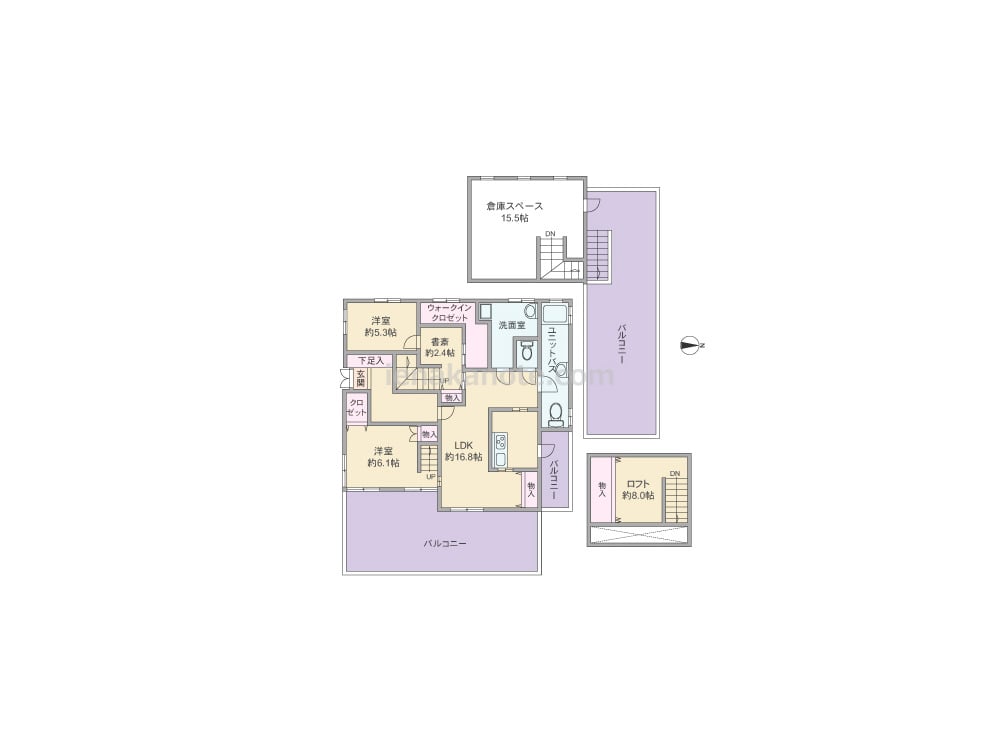 専有面積90.86平米の2SLDK。メゾネットタイプで、各フロアそれぞれに出幅のあるバルコニーとルーフバルコニー付き。二面採光の主寝室は約8.1帖大で、ロフト付き。家事動線に配慮されたツーウエイのキッチンには便利なキッチンバルコニーがあります。書斎スペース、ウォークインクロゼット、倉庫スペース付きで、各居室にほとんど家具は不要で、広々と使えます。
