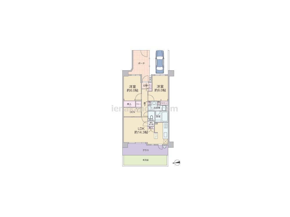 専有面積63.83平米の2SLDK。玄関前に広々とした専用ポーチと専用駐車場、LDKに面してテラスと専用庭がある一戸建て感覚のプラン。キッチンはテラス側にあり、便利な勝手口付き。廊下とリビング・ダイニングからアクセスできるDENは、収納スペースや書斎にもピッタリ。全部屋6帖以上の広さがあり、各部屋に収納スペース付きです。