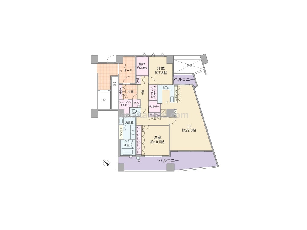 専有面積126.00平米の2SLDK。南西・北東両面バルコニー付き。玄関前にはポーチがあり、プライバシーに配慮されています。LDは広々約22.5帖、キッチンはカウンタータイプで、家事効率の良いコの字型。南西側バルコニーに面した主寝室は約10帖と広く、壁面一面がクロゼットになっておりゆったりと使えます。シューズインクロゼットやウォークインクロゼット、2.8帖大の納戸、パントリーがあり、収納スペースが充実。パントリーは廊下側からもキッチン側からも出入り可能です。浴室にはバルコニーに面した窓があり、換気がしやすく快適です。