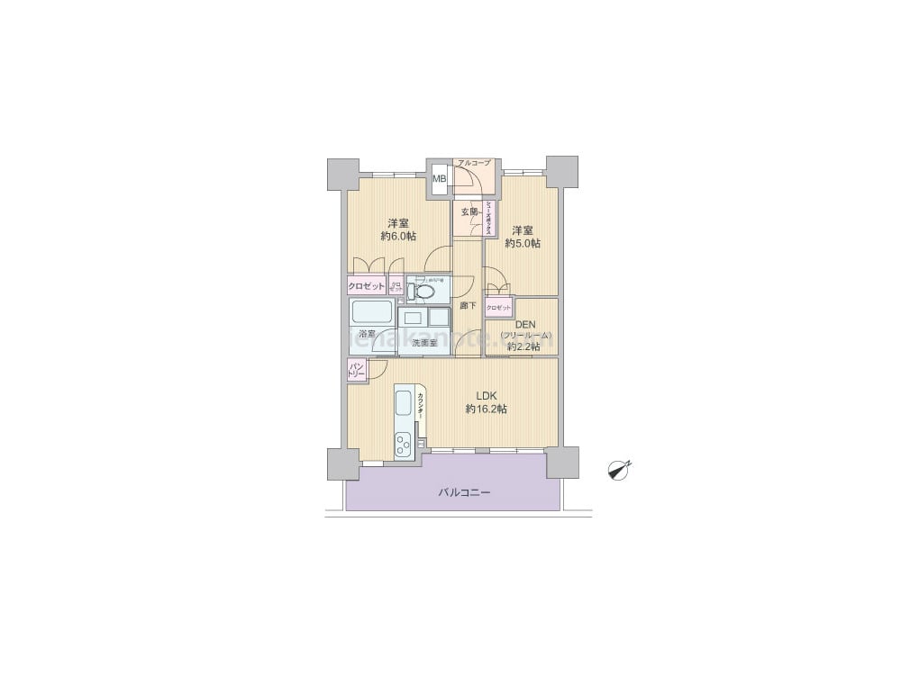 専有面積55.29平米の2SLDK。玄関前にはアルコーブ付き。キッチンはカウンタータイプで、家事をしながら家族の様子を窺うことができます。LDKに隣接して、約2.2帖のDENがあり、趣味の部屋としても収納スペースとしても利用可能。洗面室へはLDKからも廊下からもアクセスできるため家事動線にすぐれています。各部屋に収納付きで、キッチン背面にパントリー付きです。
