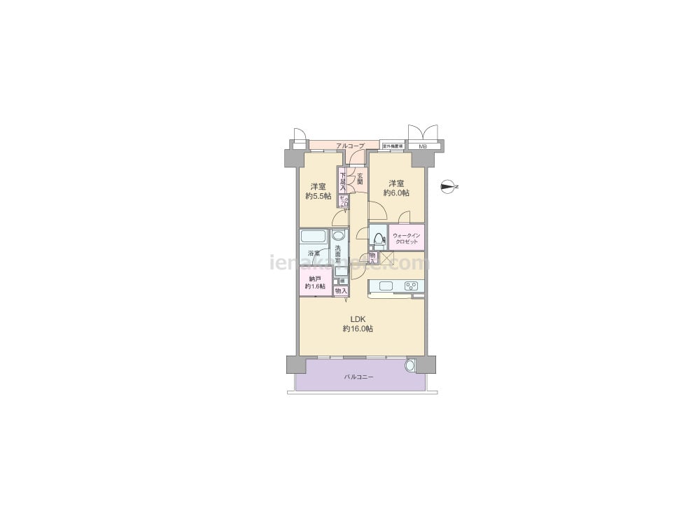 専有面積63.69平米の2SLDK。玄関前にはアルコーブ付き。キッチンはカウンタータイプで、家事をしながら家族の様子を窺うことができます。リビングには物入と約1.6帖の納戸があり、約6.0帖の洋室にはウォークインクロゼットと収納が豊富です。