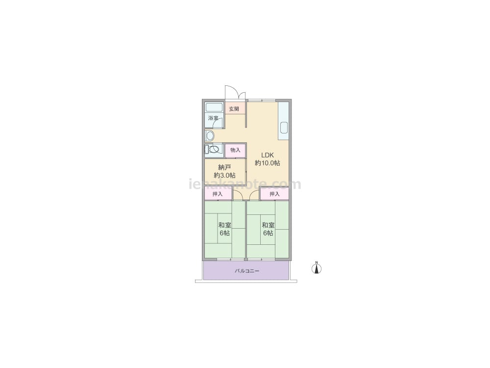 専有面積64.44平米の2SLDK。玄関を入ってすぐにLDKがある居室空間を優先したプラン。キッチンは壁付けのオープンタイプ。各部屋に収納スペース付きです。